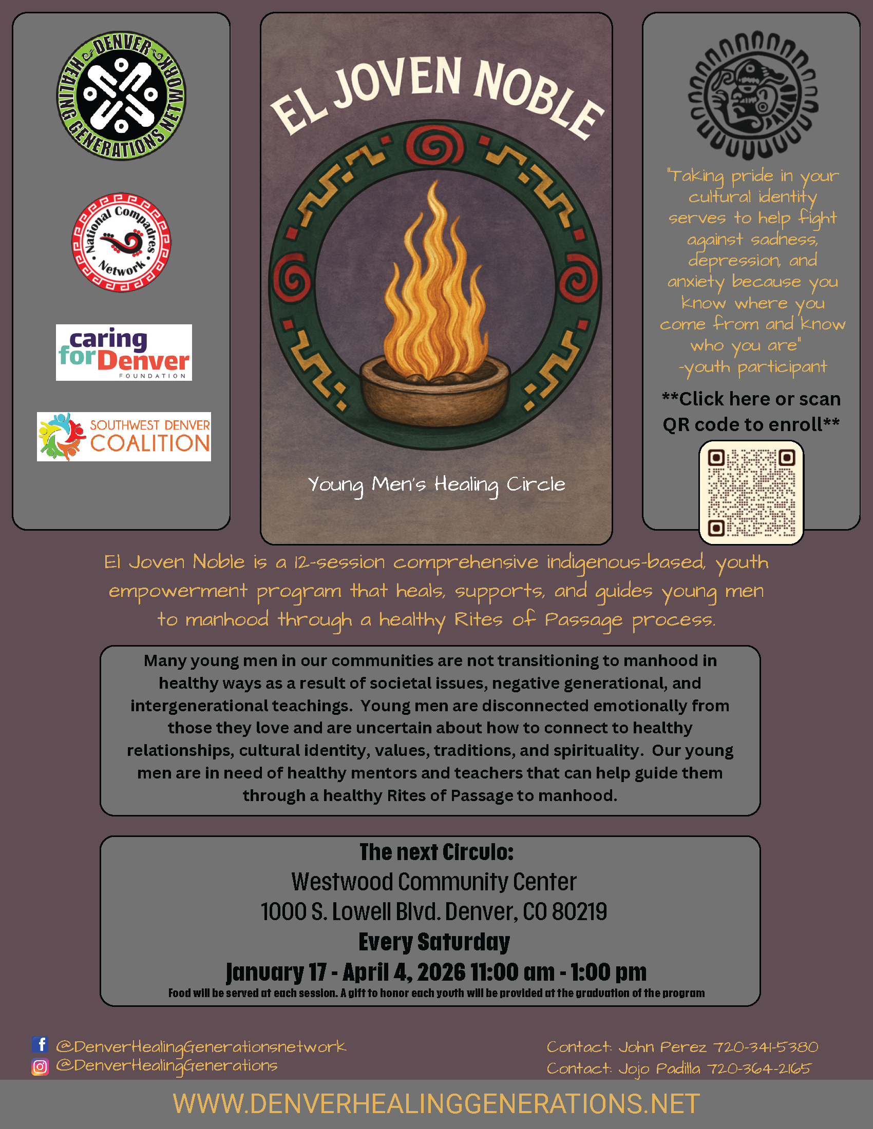 El Joven Noble is a comprehensive healing-centered, indigenous based, youth leadership development program that supports and guides young men through their initial step of a “rites of passage” process while focusing on the prevention of substance abuse, teen pregnancy, relationship violence, gang violence, and school failure.